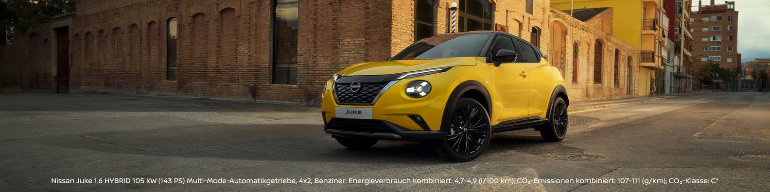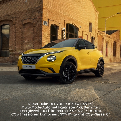Nissan Juke 1.6 HYBRID 105 kW (143 PS) Multi-Mode-Automatikgetriebe, 4x2, Benziner: Energieverbrauch kombiniert: 4,7-4,9 (l/100 km); CO₂-Emissionen kombiniert: 107-111 (g/km); CO₂-Klasse: C*